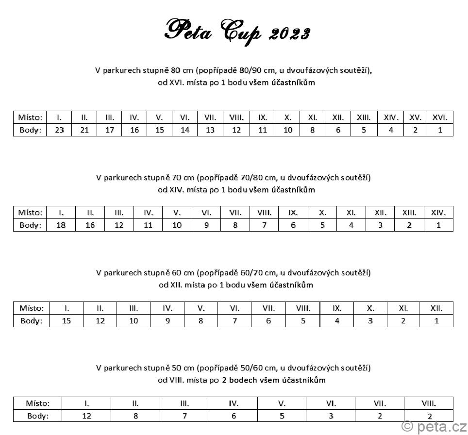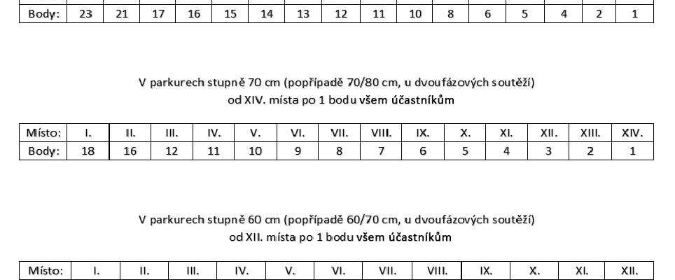 Ve finálovém kole se navíc bude soutěžit o dvojnásobný počet bodů, oproti kolům předchozím. - Do výsledků se budou započítávat body získané v soutěžích stupně “50”, “60”, “70”, a “80” cm. Popřípadě dvoufázové soutěže na úrovních “50/60”, “60/70”, “70/80” a “80/90” cm. Bodové hodnocení jednotlivých soutěží naleznete uvedené níže.